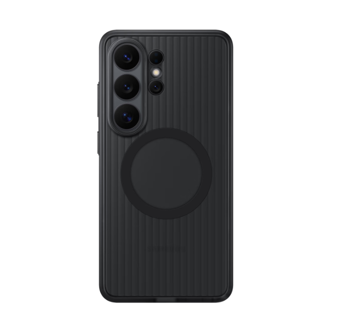 The Rugged Magnet Case absorbs shock from drops and resists scratches and impact. Tested to 5x the Military Grade Standard drop test (MIL-STD-810H), it’s built for repeated impact resistance. It passed 5 consecutive tests of 26 drops from 1.22 m, covering all faces, edges and corners for all-around protection. Raised edges protect the screen and camera, while grooved sides enhance grip. A padded inner layer adds cushioning for comfort in use. Built-in magnets help align your Galaxy S26 Ultra for fast wireless charging and allow easy attachment of compatible magnetic accessories.